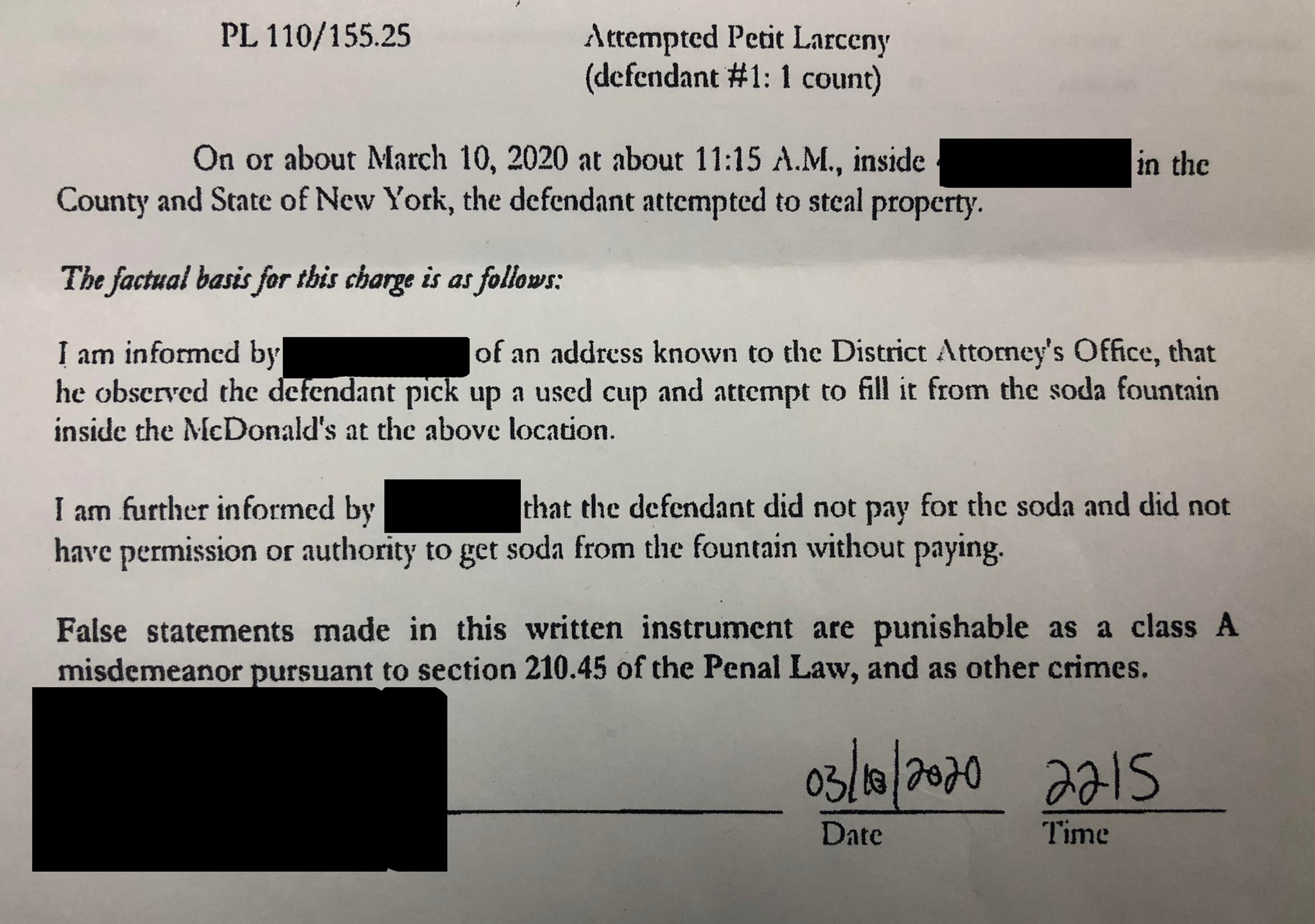 . A person commits a crime when he or she does something that goes against the laws in the New York State Penal Code. There are three types of criminal cases. Penal Law 1000.
